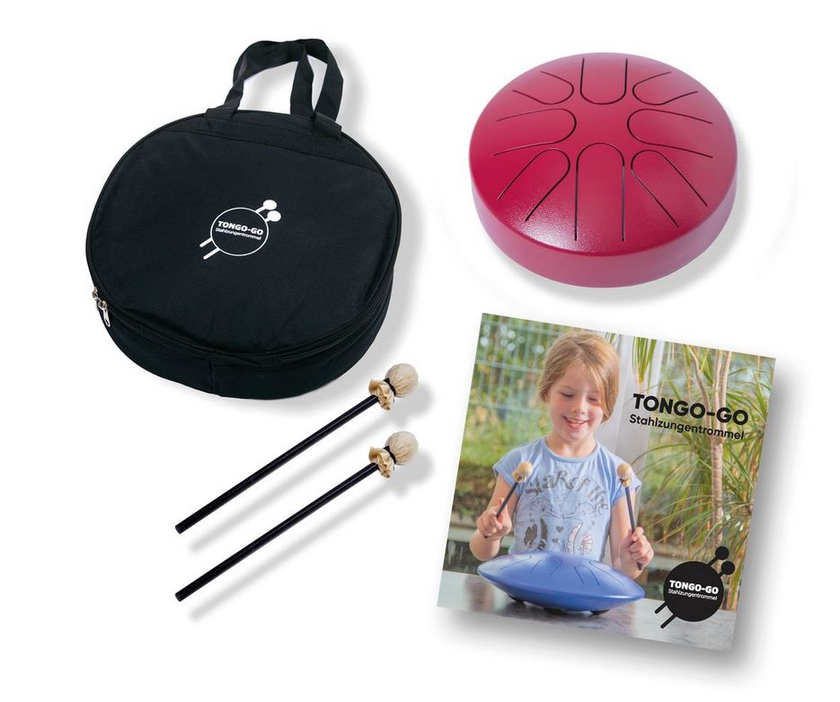 Die TONGO-GO Mini Steel Tongue Drum ist eine kompakte Stahlzungentrommel mit 8 Zungen in C-Dur (Tonumfang C–C"). Mit ihrem klaren, harmonischen Klang eignet sie sich ideal für Kinder und Anfänger. Sie kann intuitiv mit den Händen oder den beiliegenden gepolsterten Schlägeln gespielt werden – ohne Vorkenntnisse.