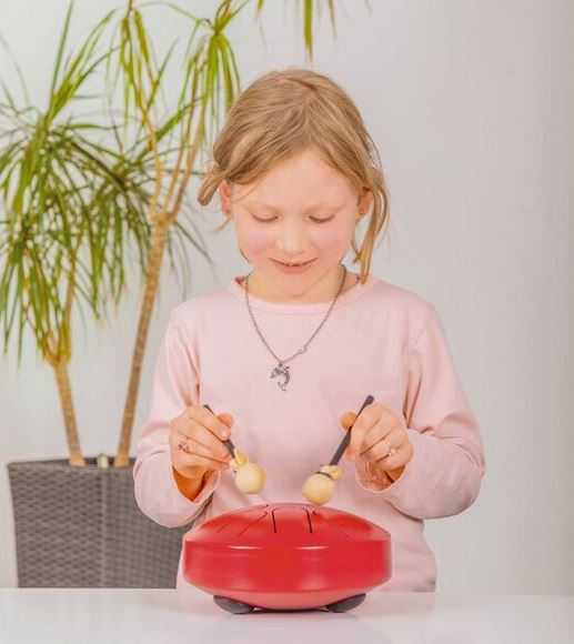 Das Spielen auf der Stahlzungentrommel fördert Feinmotorik, Koordination, Gehörbildung und Rhythmusgefühl. Dank der intuitiven Anordnung der Zungen lernen Kinder spielerisch, Klänge zu entdecken. Mit den beiliegenden Farbpunkten können die Zungen markiert und mit farbigen Noten gespielt werden.