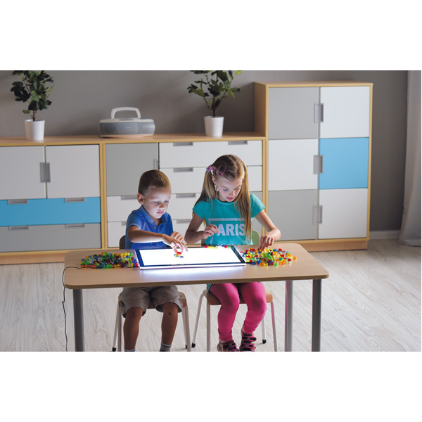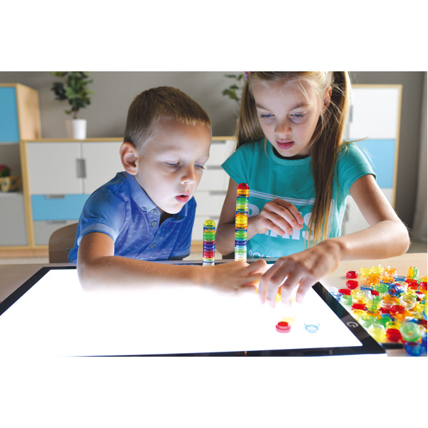 Transparente Acrylbausteine zum Konstruieren von flachen und räumlichen Strukturen, zum Aufeinanderstapeln, Mengen bilden. Besonders empfehlenswert zum Spielen auf dem Leuchtpaneel (356053 - separat bestellbar) oder zum Musterlegen auf einer Spiegeloberfläche (SET5179 Mobiler Spiegeltisch - separat bestellbar). Der Spiegel zeigt die fertige Konstruktion spiegelverkehrt und vermittelt so eine erste Vorstellung von Symmetrie.
