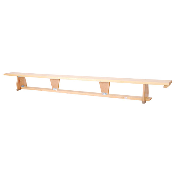 Holzbank mit Gummi-Bodenschonern, vielseitig einsetzbar. Verzinkte Stahlprofile an Verbindungselementen sorgen für Stabilität und Sicherheit; alle Kanten sind abgerundet. Mit Halterung zum Einhängen an Sprossenwand oder Turnkasten. Wenn man die Bank umdreht, entsteht ein Schwebebalken von 10 cm Breite.