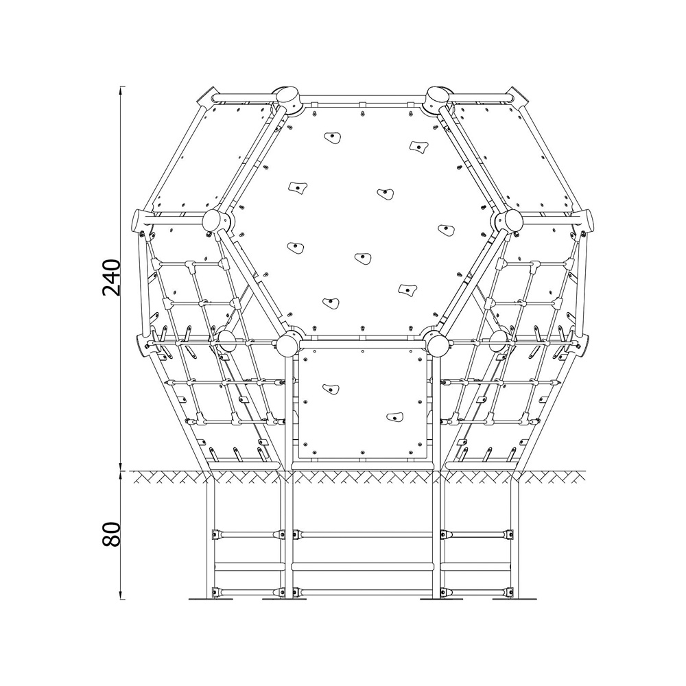 Wer bewohnt den geheimnisvollen Planeten? Er kann von innen und aussen erkundet werden (Klettergriffe nur aussen). Mit Kletterwänden und Kletternetzen.