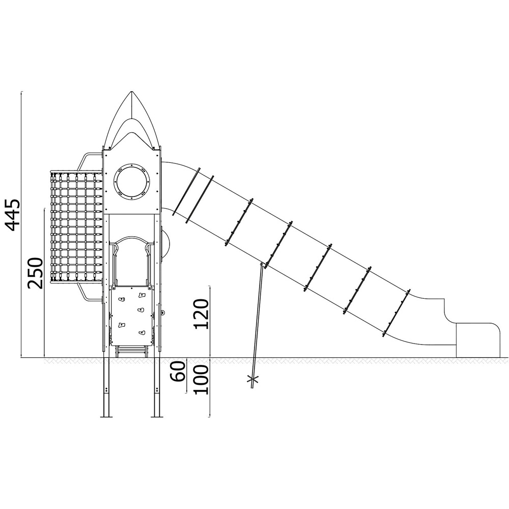 Wer die Raumstation durch die lange Rutsche verlassen will, muss einiges an Klettergeschick beweisen. Über Klettergriffe geht es ins sichere Basismodul und von dort übers Aussennetz auf die obere Ebene, wo ein schöner Ausblick ins Weltall lockt. Mit Kletterwänden, Kletternetz, 3 Bullaugen und 2 Rutschen.