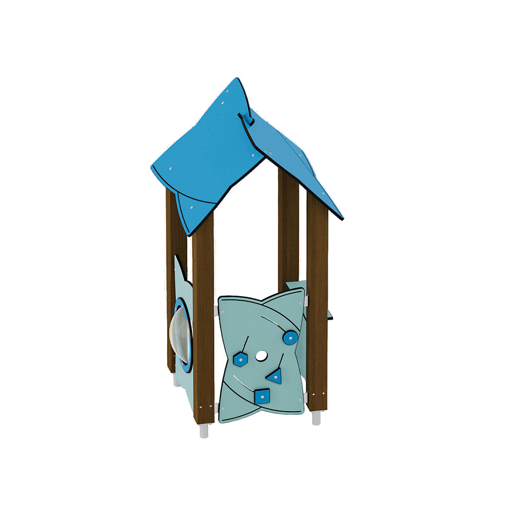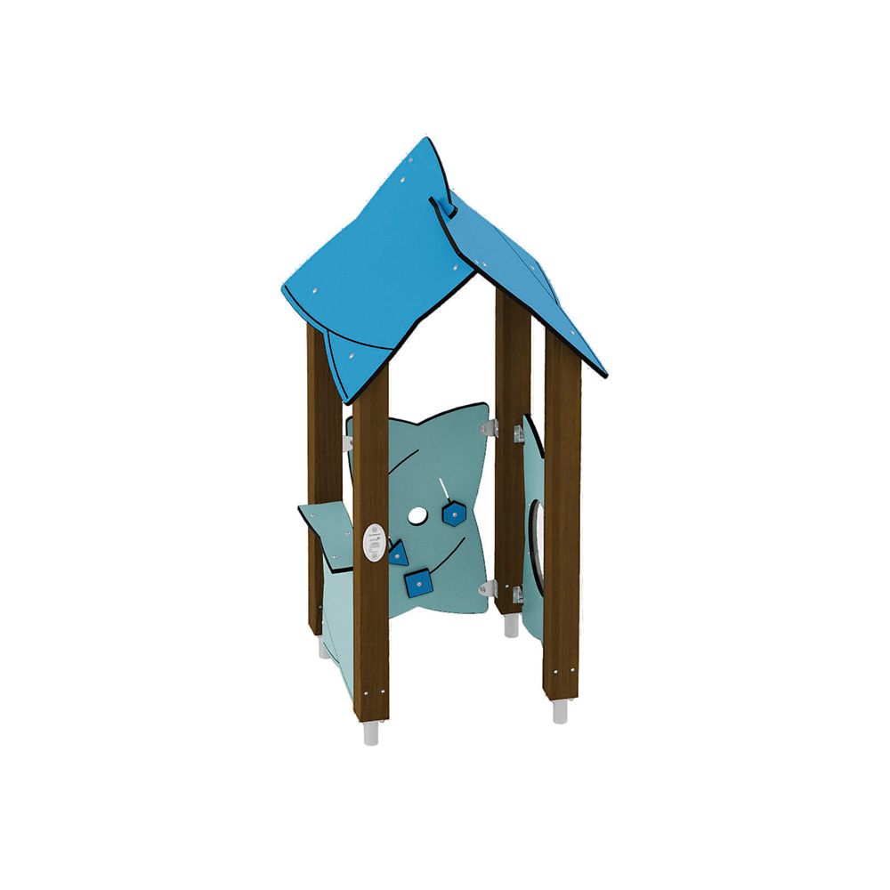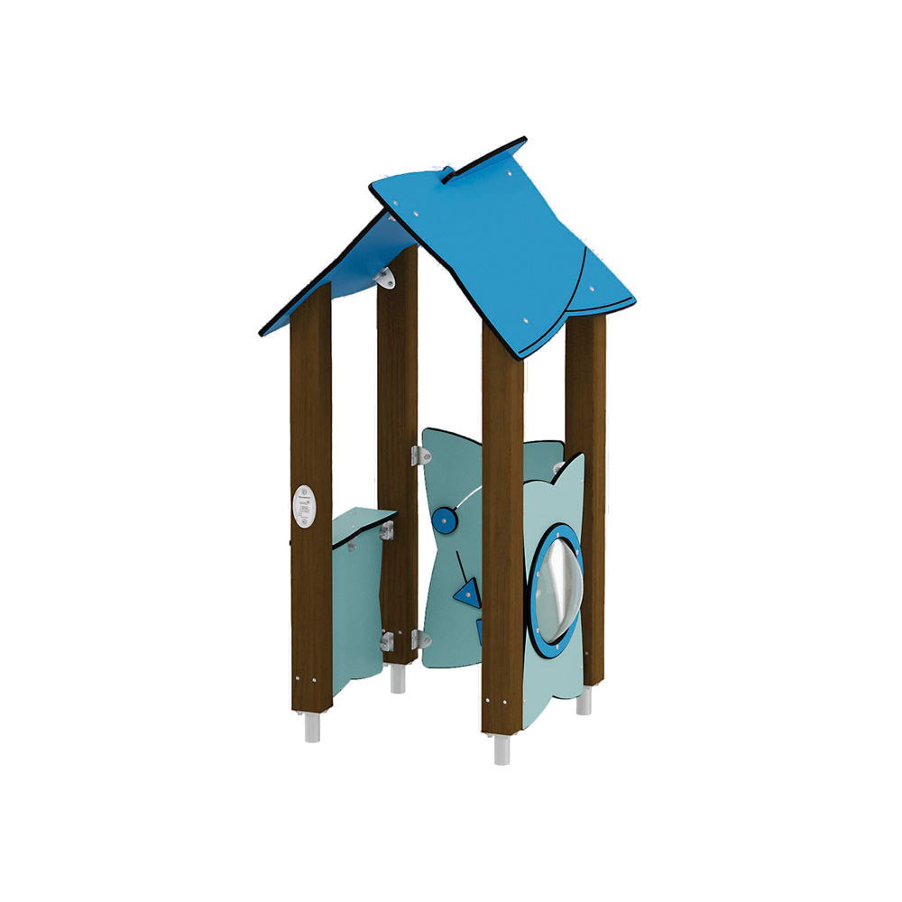 Das farbenfrohe Häuschen mit Bullauge, Ladentheke und Motorikwand mit Schiebespiel dient kleinen und grösseren Kindern als Ort für Rollenspiele oder Rückzugsort vom Spielplatztrubel. Durch seine offene Bauweise ist es barrierefrei zugänglich. • Anzahl der Nutzer: 2 • Grundfläche: 85 x 81 cm • Sicherheitsbereich: 385 x 381 cm (Fläche: 13 m²) • Gesamthöhe: 166 cm • max. freie Fallhöhe: 57 cm • ab 12 Monate