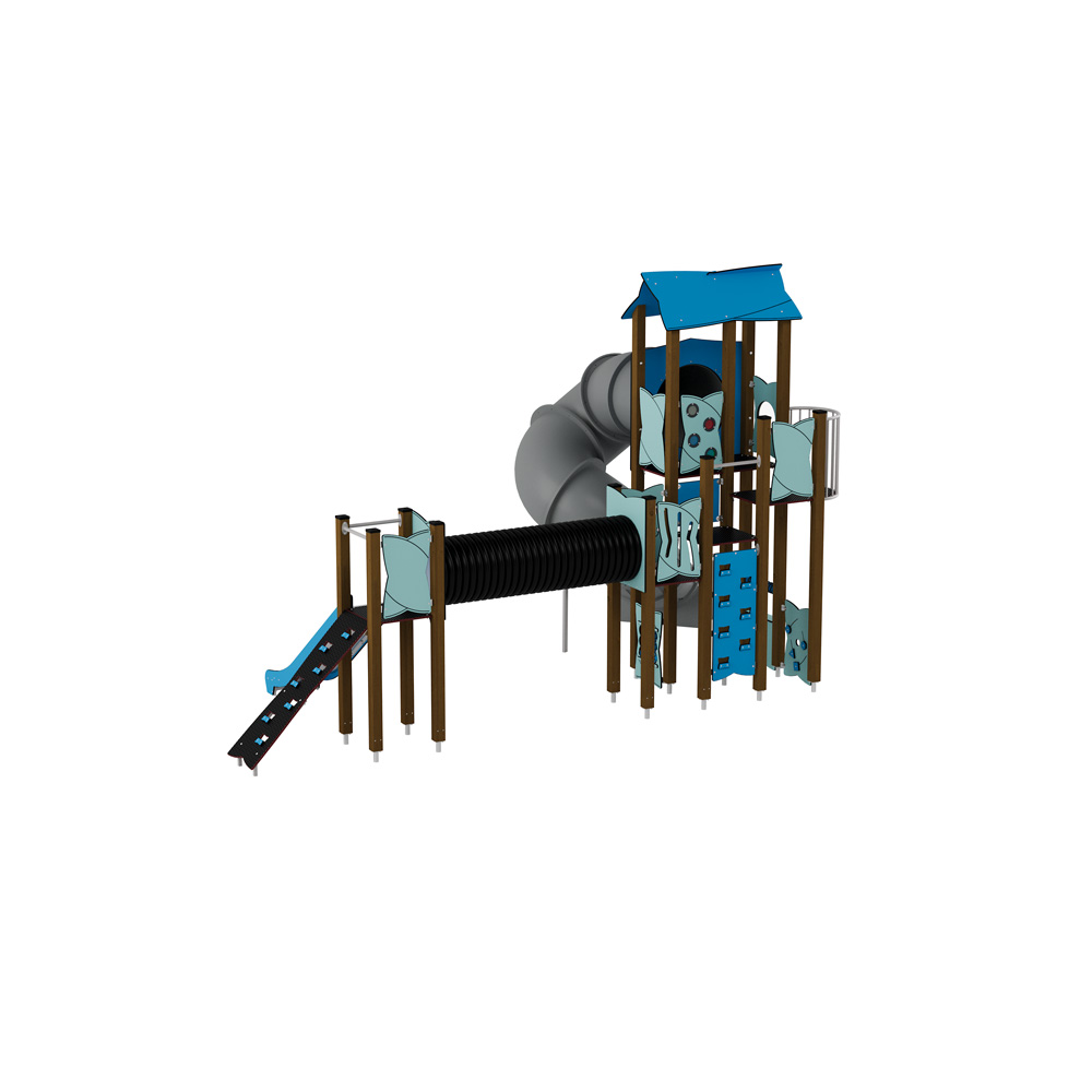 Das Spielplatzset mit riesiger Röhrenrutsche und Tunnel zieht kleine Entdecker und Tobegeister magisch an! Kletterwände und eine offene Rutsche sind weitere Attraktionen, die zu Bewegung einladen und die körperliche Fitness fördern. Balkon, Bullauge und die Ladentheke darunter regen die Fantasie an und stellen eine tolle Kulisse für Rollenspiele dar. Diverse Sensorik-Motorik-Wände bieten zusätzliche Spielmöglichkeiten. So ist die Anlage sehr vielseitig und lässt niemals Langeweile aufkommen. • Röhrenrutsche aus PE • Anzahl der Nutzer: 12 • Grundfläche: 632 x 354 cm • Sicherheitsbereich: 970 x 708 cm (Fläche: 52 m²) • Gesamthöhe: 381 cm • max. freie Fallhöhe: 200 cm • Podesthöhen: 120, 150, 180 und 200 cm • ab 5 Jahre