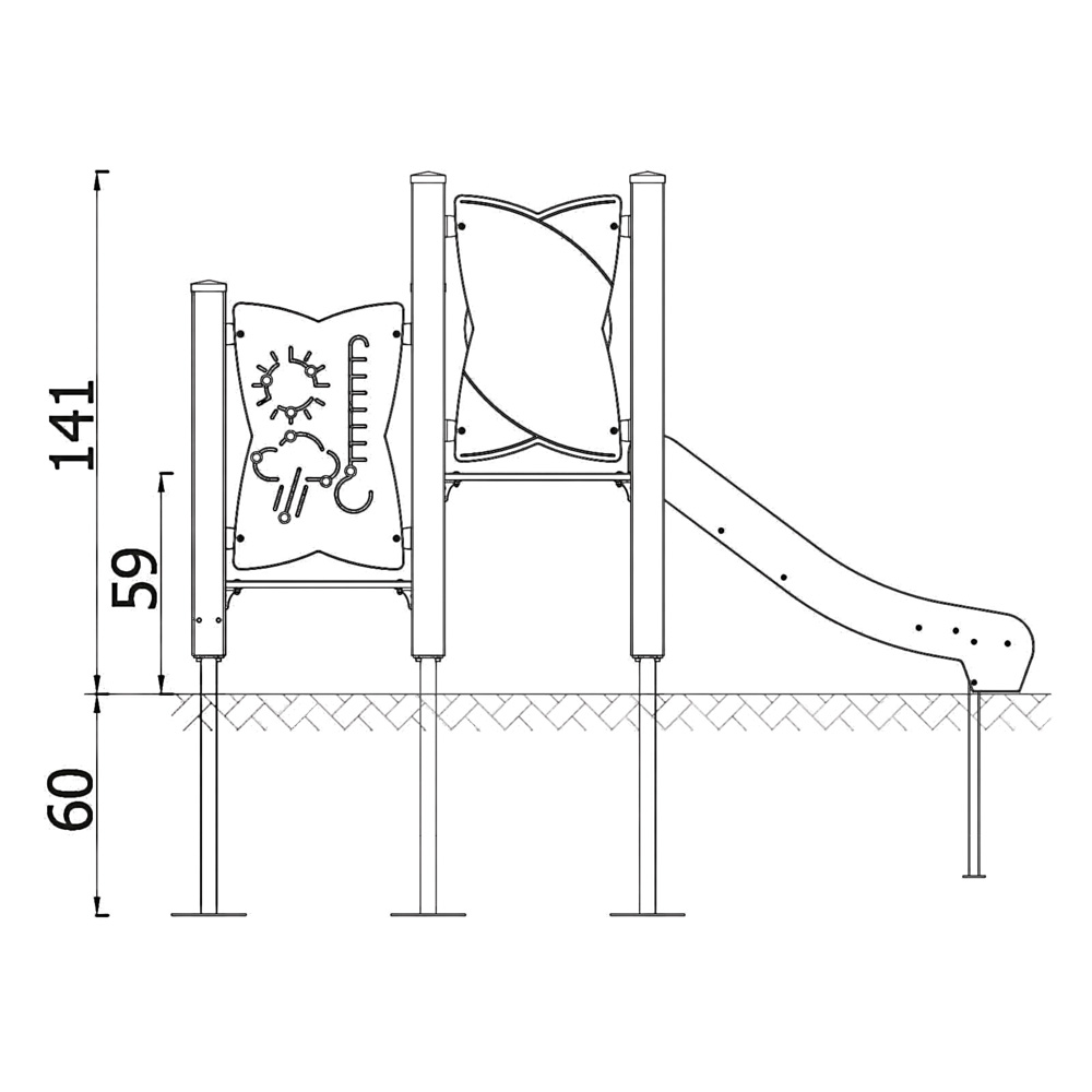 Podestkombination mit Rutsche für die Jüngsten, die zudem viel Beschäftigung bietet: Spielwände mit Schiebespielen und bunten Plexiglasfensterchen laden die Kleinen zum Entdecken ein, das Bullauge verströmt einen Hauch von Abenteuer. • Anzahl der Nutzer: 5 • Grundfläche: 226 x 127 cm • Sicherheitsbereich: 476 x 427 cm (Fläche: 16,5 m²) • Gesamthöhe: 141 cm • max. freie Fallhöhe: 59 cm • Podesthöhen: 30 und 59 cm • ab 3 Jahre