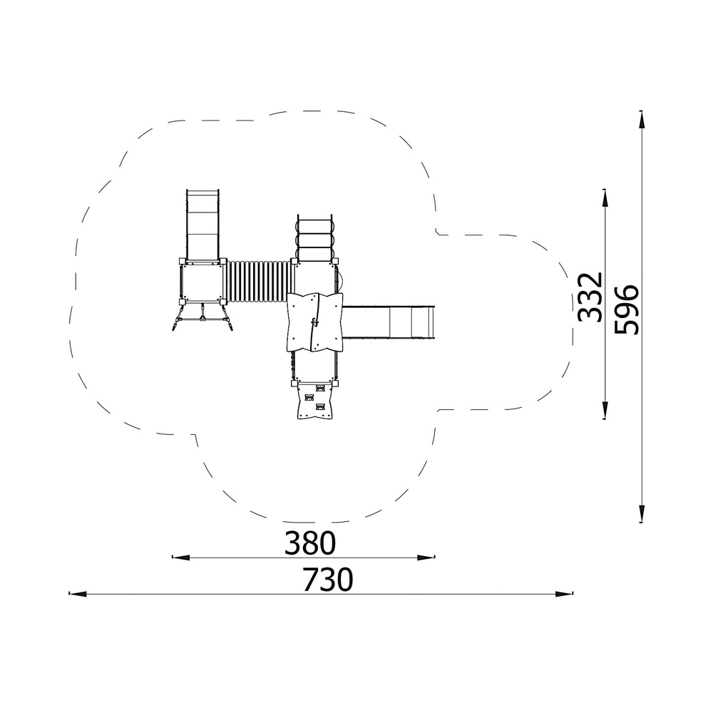 Spielanlage mit Tunnel und 2 Rutschen. Dank niedriger Podeste und einfacher Aufgänge eignet sie sich auch schon für jüngere Kinder. Nach und nach wagen sie sich an grössere Herausforderungen wie Kletterwand und Netzaufgang. Für Abwechslung sorgen Motorikspielwände und ein grosses Bullauge. • Anzahl der Nutzer: 10 • Grundfläche: 380 x 332 cm • Sicherheitsbereich: 730 x 596 cm (Fläche: 30,5 m²) • Gesamthöhe: 257 cm • max. freie Fallhöhe: 90 cm • Podesthöhen: 59 und 90 cm • ab 3 Jahre