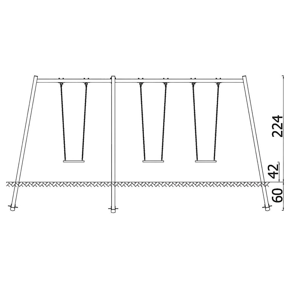 Klassisches Schaukelgestell aus Stahl, verzinkt und pulverbeschichtet in den Farben der Serie Urbi - sicher, stabil und langlebig. Passt perfekt zu den übrigen Geräten der Urbi-Serie und komplettiert jeden Spielplatz. Schaukeln macht allen Kindern Spass, fördert die motorische Entwicklung, verbessert das Gleichgewicht und wirkt sich positiv auf das Nervensystem aus. Schaukelsitze separat zu bestellen. • Anzahl der Nutzer: 3 • Grundfläche: 539 x 147 cm • Sicherheitsbereich: 460 x 740 cm (Fläche: 34 m²) • Gesamthöhe: 224 cm • max. freie Fallhöhe: 130 cm