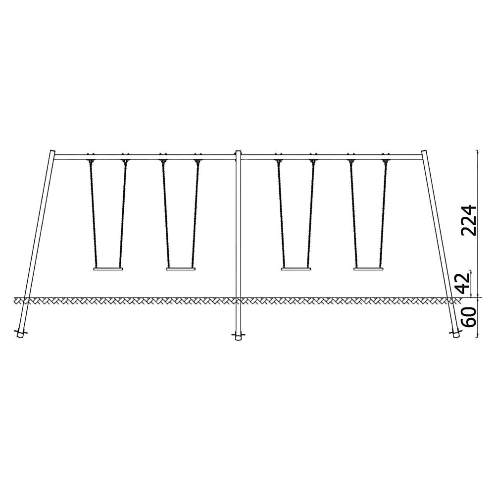 Klassisches Schaukelgestell aus Stahl, verzinkt und pulverbeschichtet in den Farben der Serie Urbi - sicher, stabil und langlebig. Passt perfekt zu den übrigen Geräten der Urbi-Serie und komplettiert jeden Spielplatz. Schaukeln macht allen Kindern Spaß, fördert die motorische Entwicklung, verbessert das Gleichgewicht und wirkt sich positiv auf das Nervensystem aus. Schaukelsitze separat zu bestellen. • Anzahl der Nutzer: 4 • Grundfläche: 649 x 147 cm • Sicherheitsbereich: 570 x 740 cm (Fläche: 42,5 m²) • Gesamthöhe: 224 cm • max. freie Fallhöhe: 130 cm