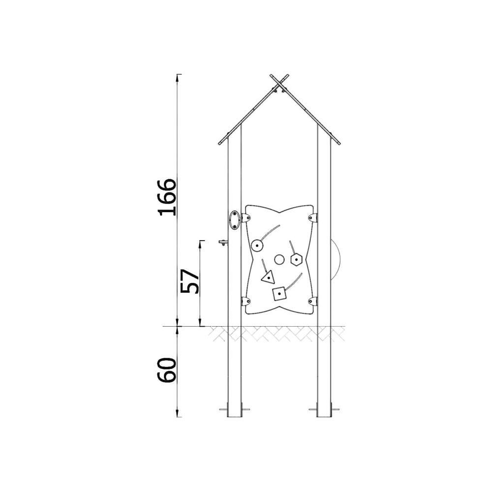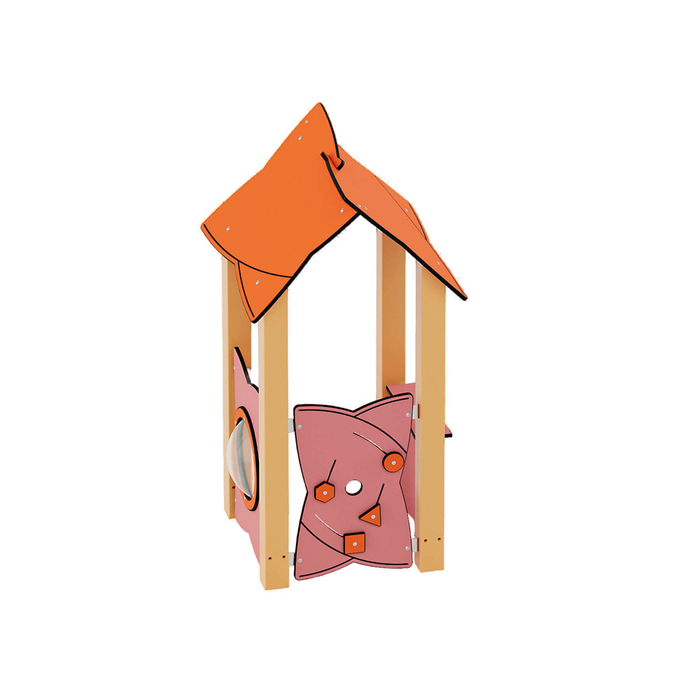 Das farbenfrohe Häuschen mit Bullauge, Ladentheke und Motorikwand mit Schiebespiel dient kleinen und grösseren Kindern als Ort für Rollenspiele oder Rückzugsort vom Spielplatztrubel. Durch seine offene Bauweise ist es barrierefrei zugänglich. • Anzahl der Nutzer: 2 • Grundfläche: 85 x 81 cm • Sicherheitsbereich: 385 x 381 cm (Fläche: 13 m²) • Gesamthöhe: 166 cm • max. freie Fallhöhe: 57 cm • ab 12 Monate