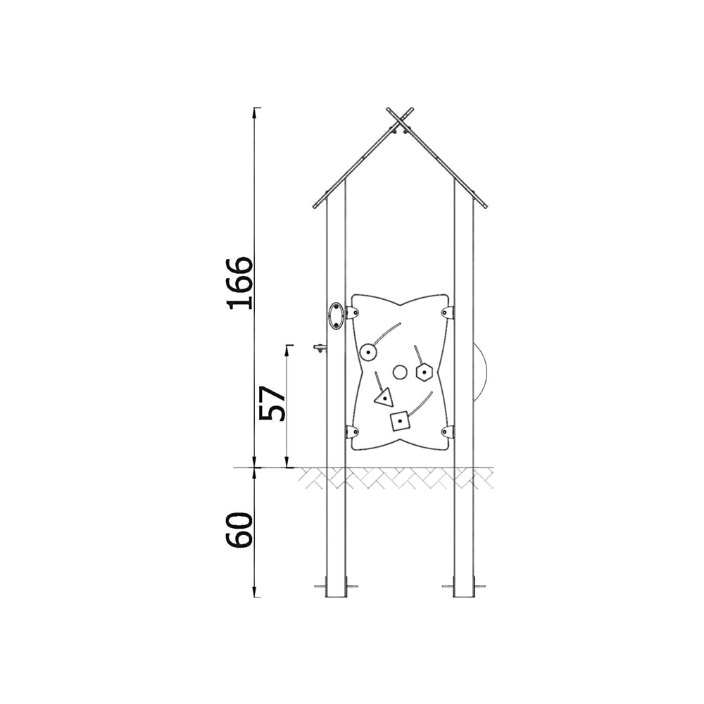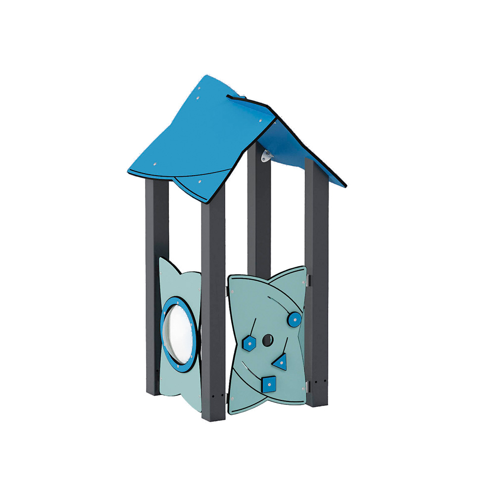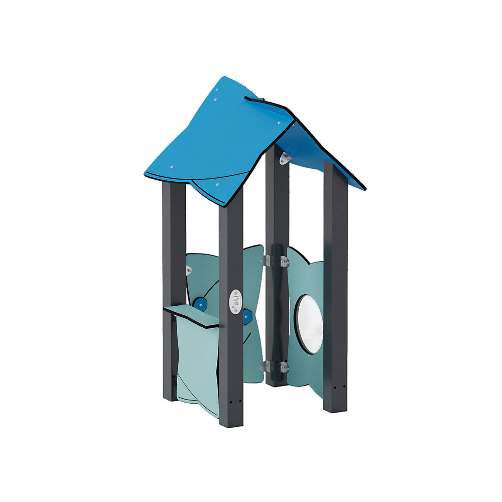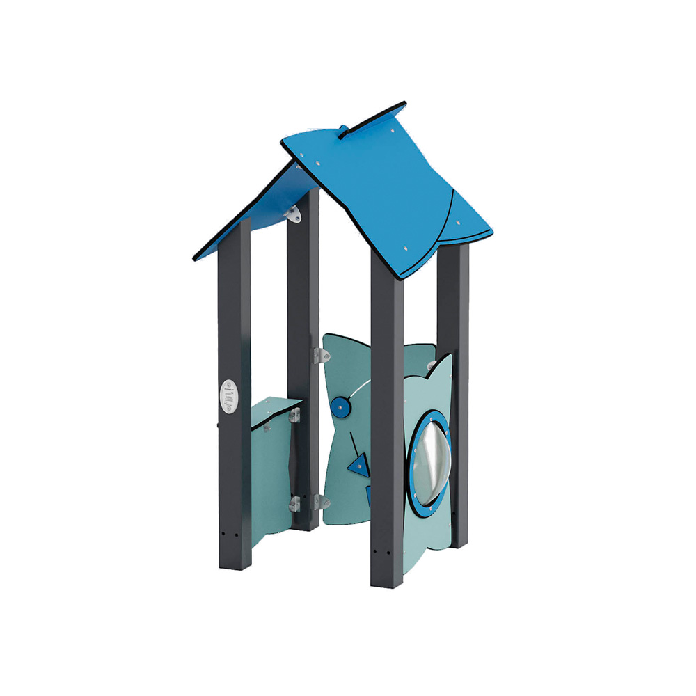 Das farbenfrohe Häuschen mit Bullauge, Ladentheke und Motorikwand mit Schiebespiel dient kleinen und grösseren Kindern als Ort für Rollenspiele oder Rückzugsort vom Spielplatztrubel. Durch seine offene Bauweise ist es barrierefrei zugänglich. • Anzahl der Nutzer: 2 • Grundfläche: 85 x 81 cm • Sicherheitsbereich: 385 x 381 cm (Fläche: 13 m²) • Gesamthöhe: 166 cm • max. freie Fallhöhe: 57 cm • ab 12 Monate