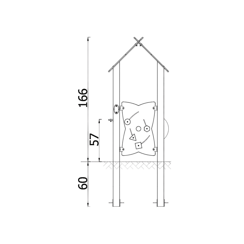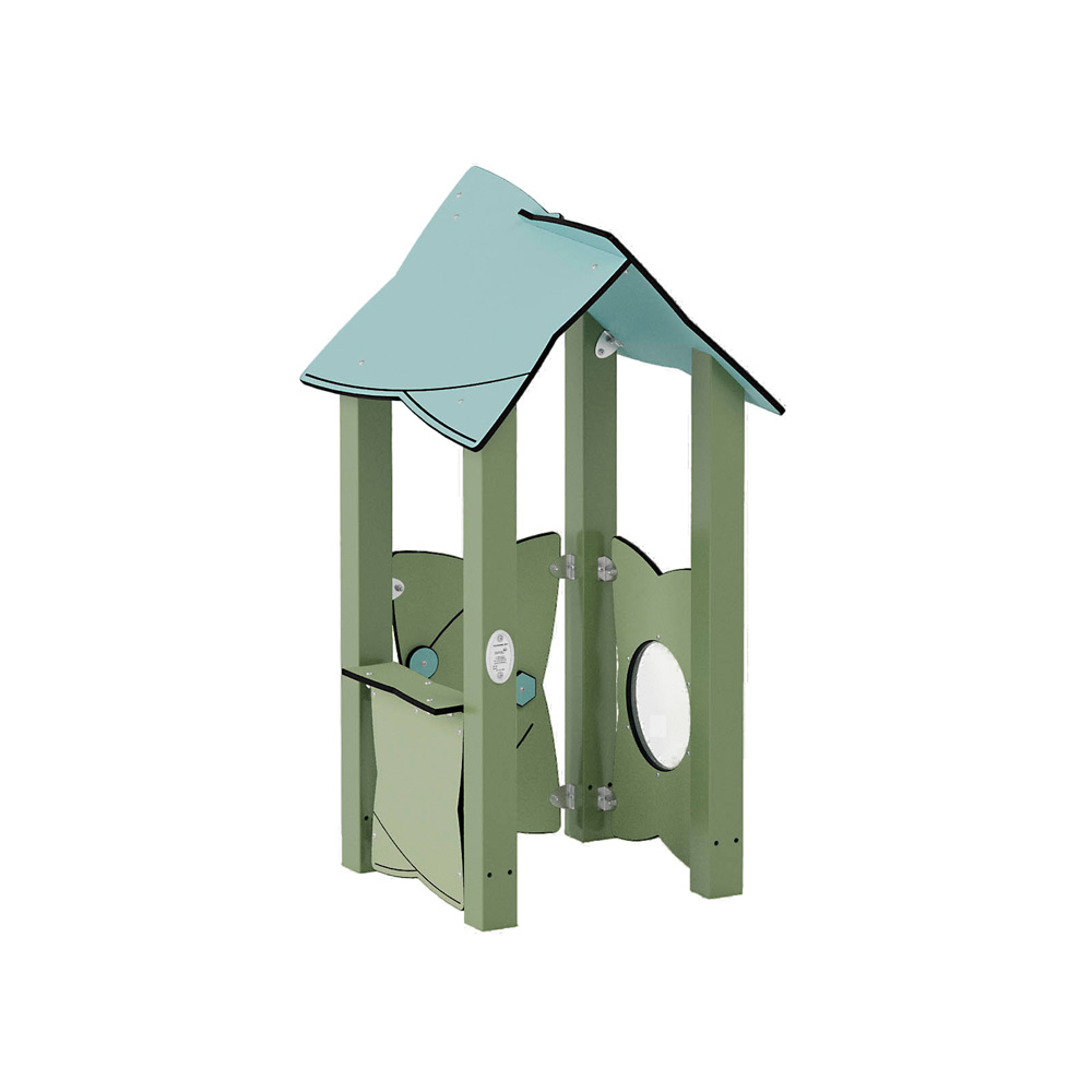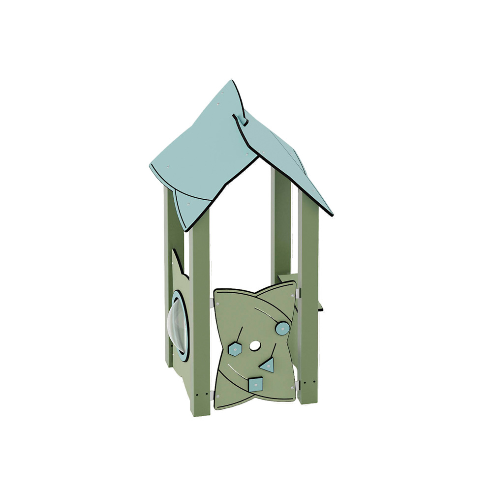 Das farbenfrohe Häuschen mit Bullauge, Ladentheke und Motorikwand mit Schiebespiel dient kleinen und grösseren Kindern als Ort für Rollenspiele oder Rückzugsort vom Spielplatztrubel. Durch seine offene Bauweise ist es barrierefrei zugänglich. • Anzahl der Nutzer: 2 • Grundfläche: 85 x 81 cm • Sicherheitsbereich: 385 x 381 cm (Fläche: 13 m²) • Gesamthöhe: 166 cm • max. freie Fallhöhe: 57 cm • ab 12 Monate