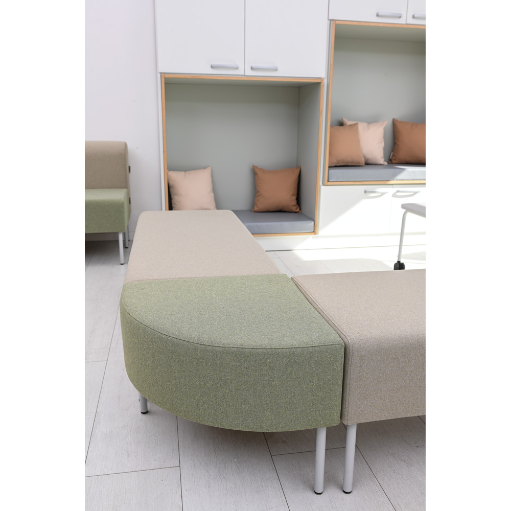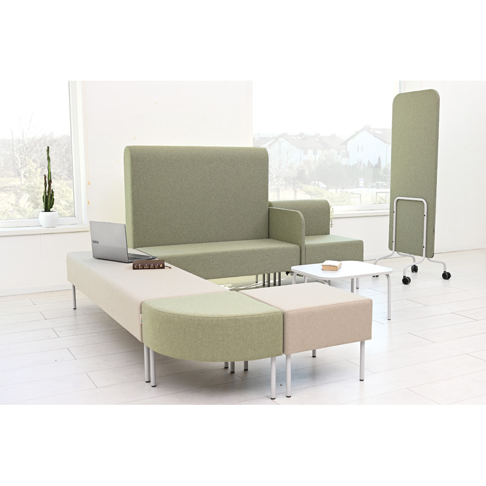 Die einzelnen Elemente sind in mehreren gedeckten, aufeinander abgestimmten Farben erhältlich. Schlanke Stahlbeine verleihen den Modulen Leichtigkeit. Sitz und Rückenlehne sind mit einem strapazierfähigen Polyestergewebe bezogen, das auf Schwerentflammbarkeit geprüft wurde.