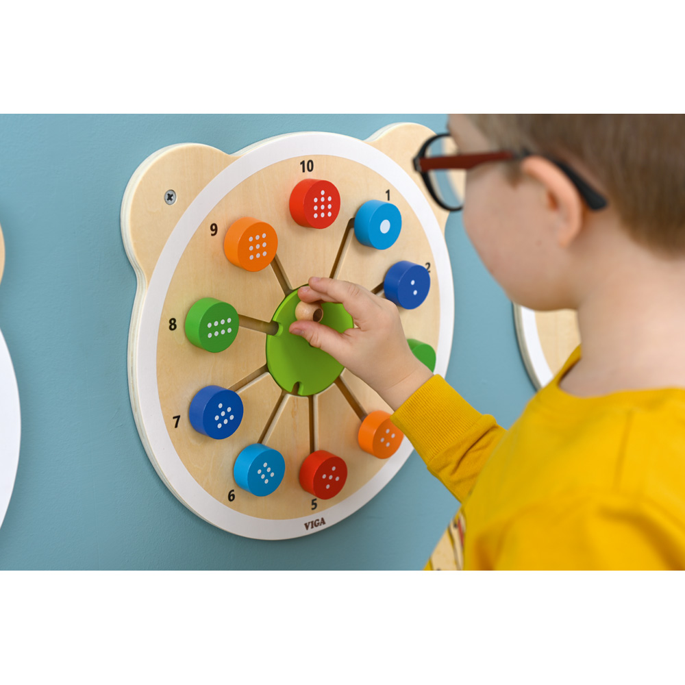 Wandapplikationen in Form eines Bärenkopfes, mit diversen Motorikspielen. Ideal zum Trainieren der Auge-Hand-Koordination, der Farberkennung und des logischen Denkens.