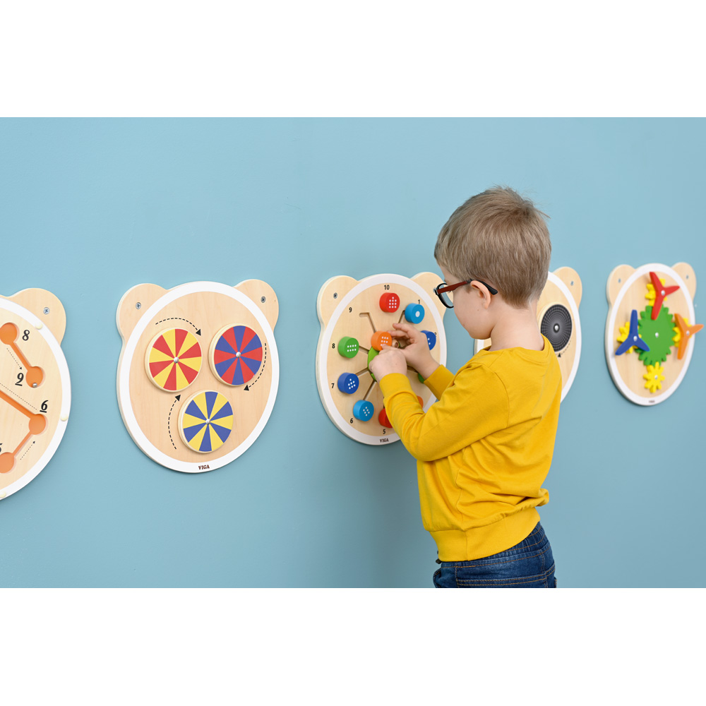 Wandapplikationen in Form eines Bärenkopfes, mit diversen Motorikspielen. Ideal zum Trainieren der Auge-Hand-Koordination, der Farberkennung und des logischen Denkens.