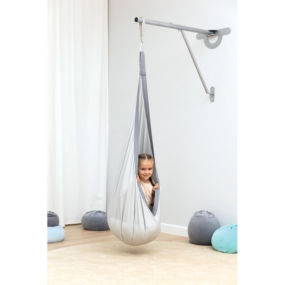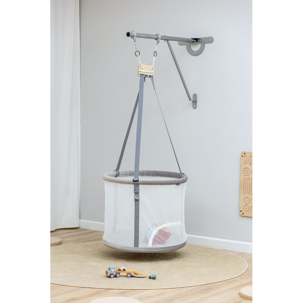 Ein Hängekorb als sicherer Ort zum Spielen und Entspannen. Der Korb schwingt flach über dem Boden und wiegt das Kind sanft hin- und her. So kann es gut zur Ruhe finden. Durch die ständige Bewegung trägt der Korb aber auch gezielt zur Entwicklung der Körperwahrnehmung und Förderung der sensorischen Integration bei. Das Kind nimmt Lageveränderungen wahr und muss seinen Körper beständig ausbalancieren. Durch die feine Gaze kann das Kind zugleich seine Umgebung ringsum wahrnehmen und Sie haben es stets im Blick. Ein Eingang, der sich per Reissverschluss öffnen lässt, ermöglicht es dem Kind, selbstständig und frei ein- und auszusteigen. Beim Einsteigen in den leicht wippenden Korb muss das Kind gleichzeitig das Gleichgewicht halten und versuchen, den Korb zu halten. Auf diese Weise trainiert es auch Koordination und Motorik und stärkt die Muskeln. Und nicht zuletzt macht Schaukeln einfach Spass, vor allem weil das Kind den Korb durch eigene Gewichtsverlagerung in Bewegung setzen kann. Mit bunten Bällen lässt sich der Hängekorb sogar zum Ballbad umfunktionieren.