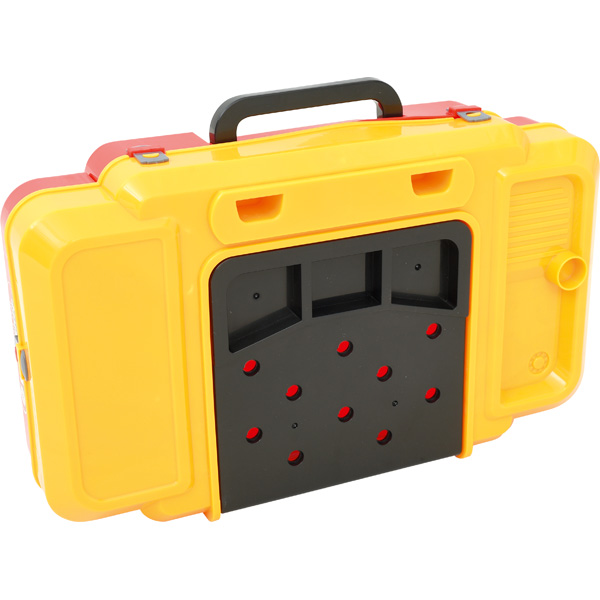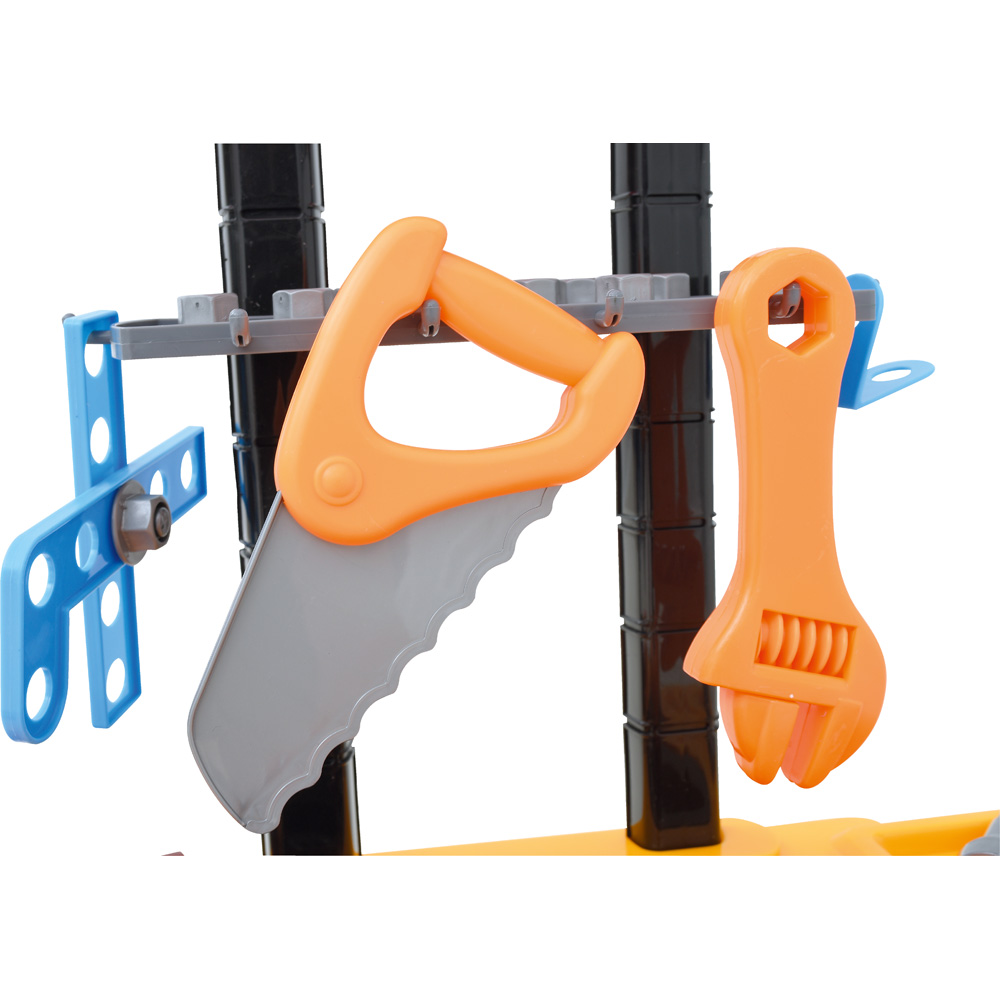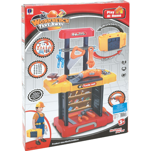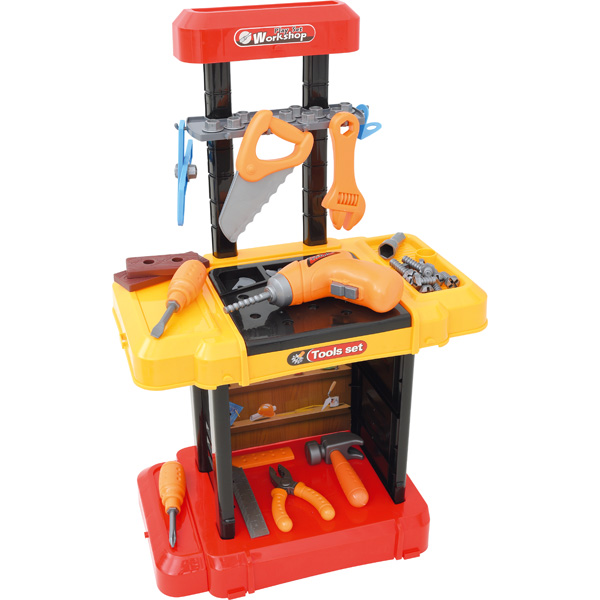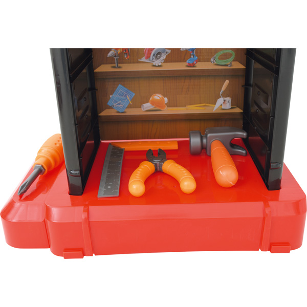 Bunte Werkbank, unentbehrlich für alle jungen Mechaniker. Mit den vielen Werkzeugen lässt sich jede Autoreparatur am Spielzeug nachstellen. Klappbar: mal ein Koffer, mal eine Werkbank.