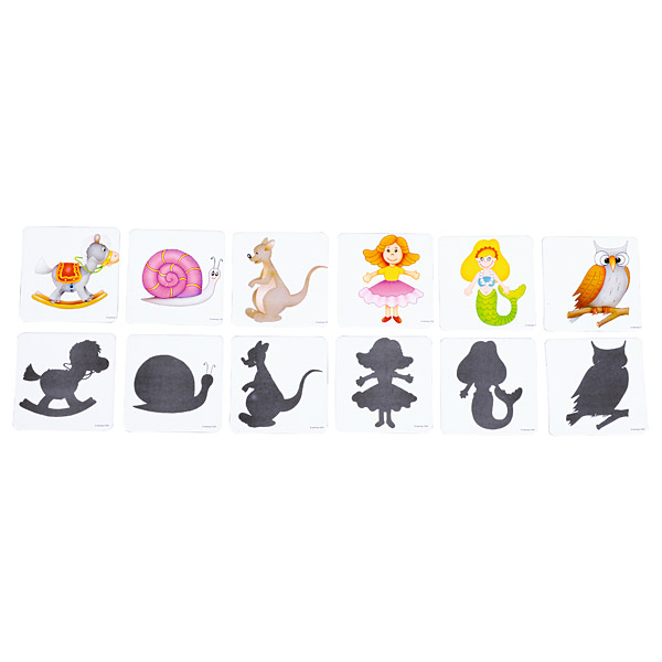 Dieses lustige Suchspiel fördert Beobachtungsgabe und Abstraktionsvermögen, lehrt Formen zu unterscheiden und beflügelt die Fantasie der Kinder. Auf Kärtchen sind Tiere, Märchenfiguren und andere Motive abgebildet; jeweils als Original und Schatten. Aufgabe der Kinder ist es, die Schatten dem jeweiligen Motiv zuzuordnen.