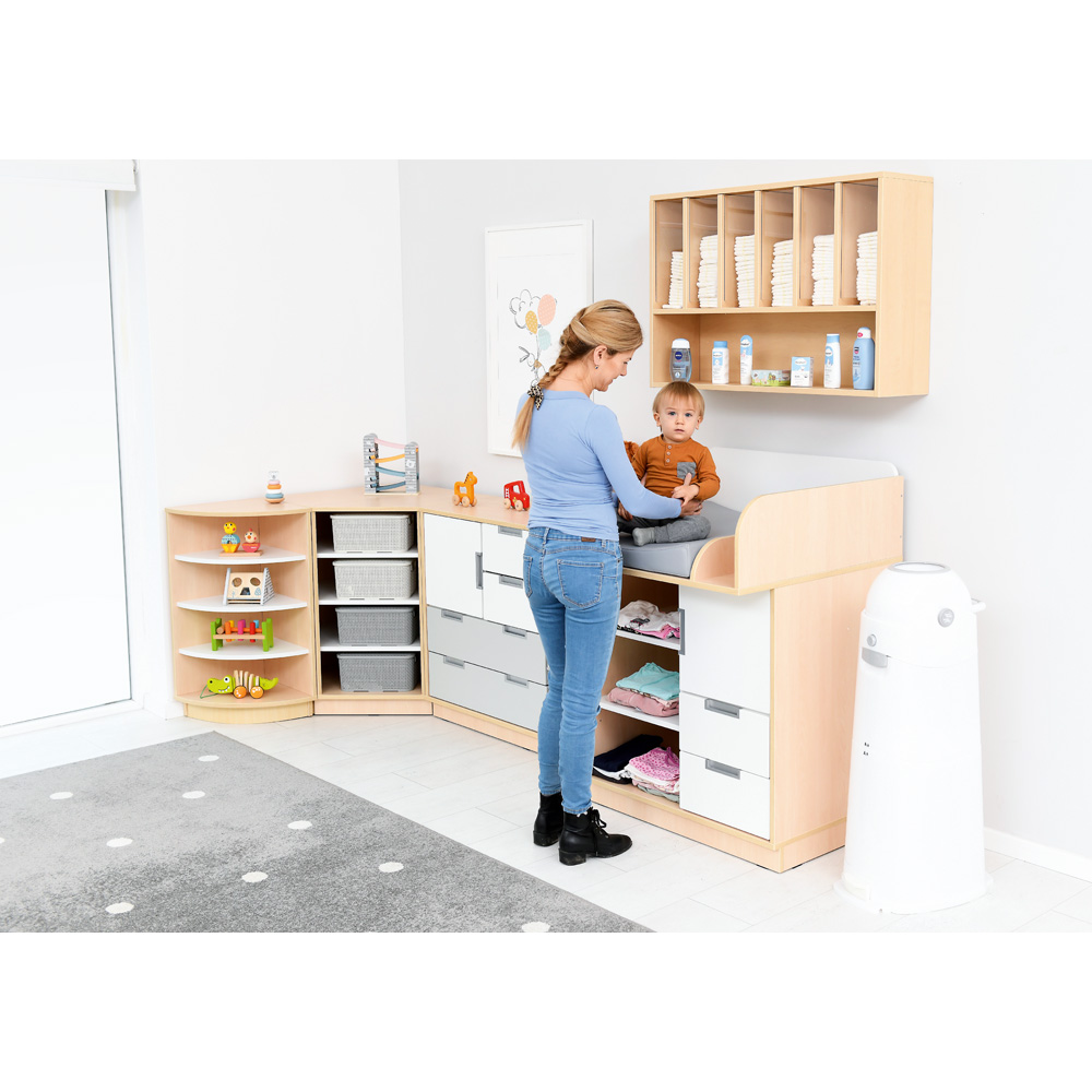 Wickelkommode in freundlichen, hellen Farbtönen mit vielen Fächern für Utensilien, stabil und praktisch.
