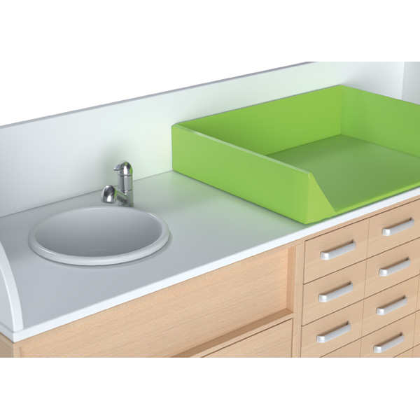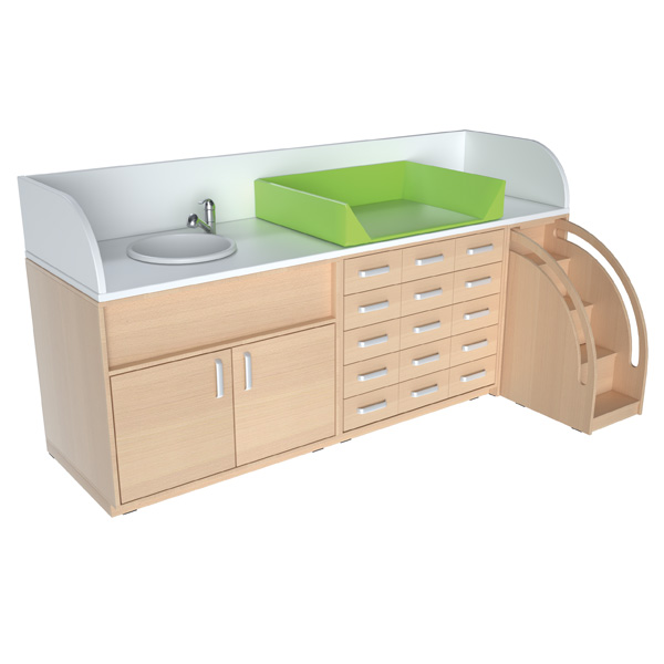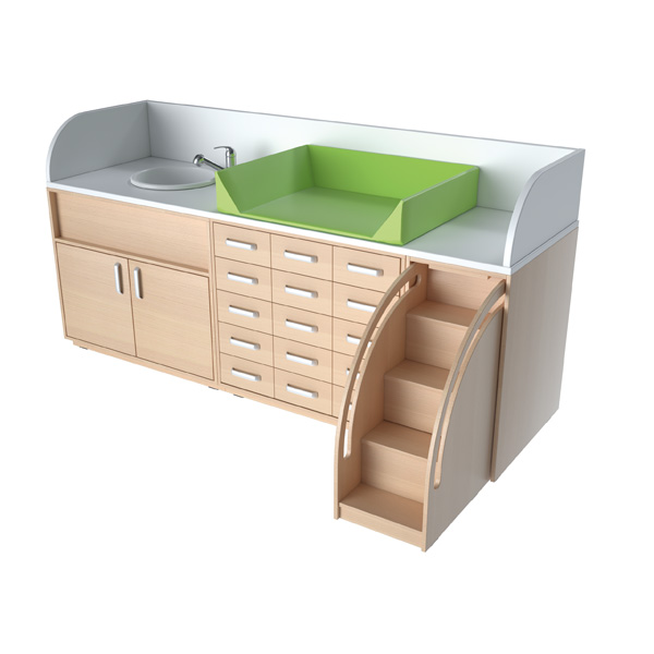 Wickelkommodenlandschaft 4 besteht aus Treppe, Wickelkommode mit 15 Schubladen, Badewannen- oder Waschbeckenschrank mit Wanne (oder Becken) und durchgehender Arbeitsplatte; inklusive Armatur und Wickelauflage.