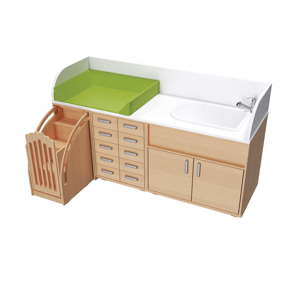 Mit Treppe inkl. Tür, Wickelkommode mit 10 Schubladen, Badewannenschrank und durchgehender Arbeitsplatte mit Sicherheitsaufkantung; inklusive Wanne, Armatur und Wickelauflage. • Treppe links, ausziehbar bis 66,3 cm, mit Auszugsstopp und Sicherheitsverriegelung