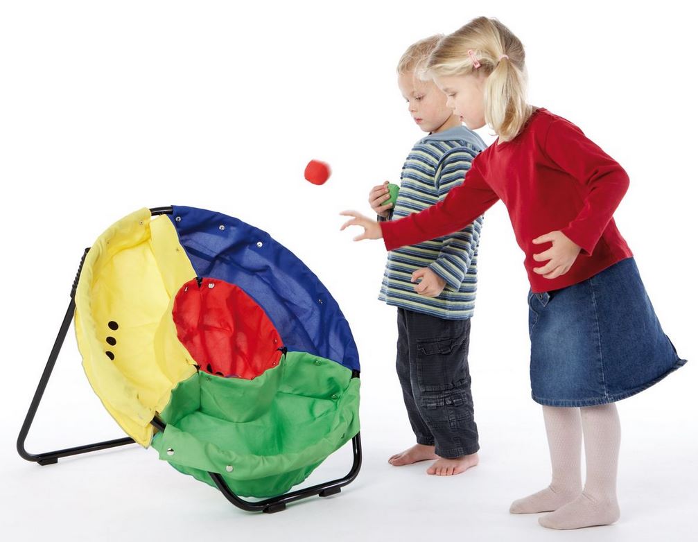 An der stabilen Konstruktion sind vier unterschiedlich farbige Fangbeutel aus Polyester befestigt, die sich hervorragend für Wurfspiele und Bewegungstrainings eignen.