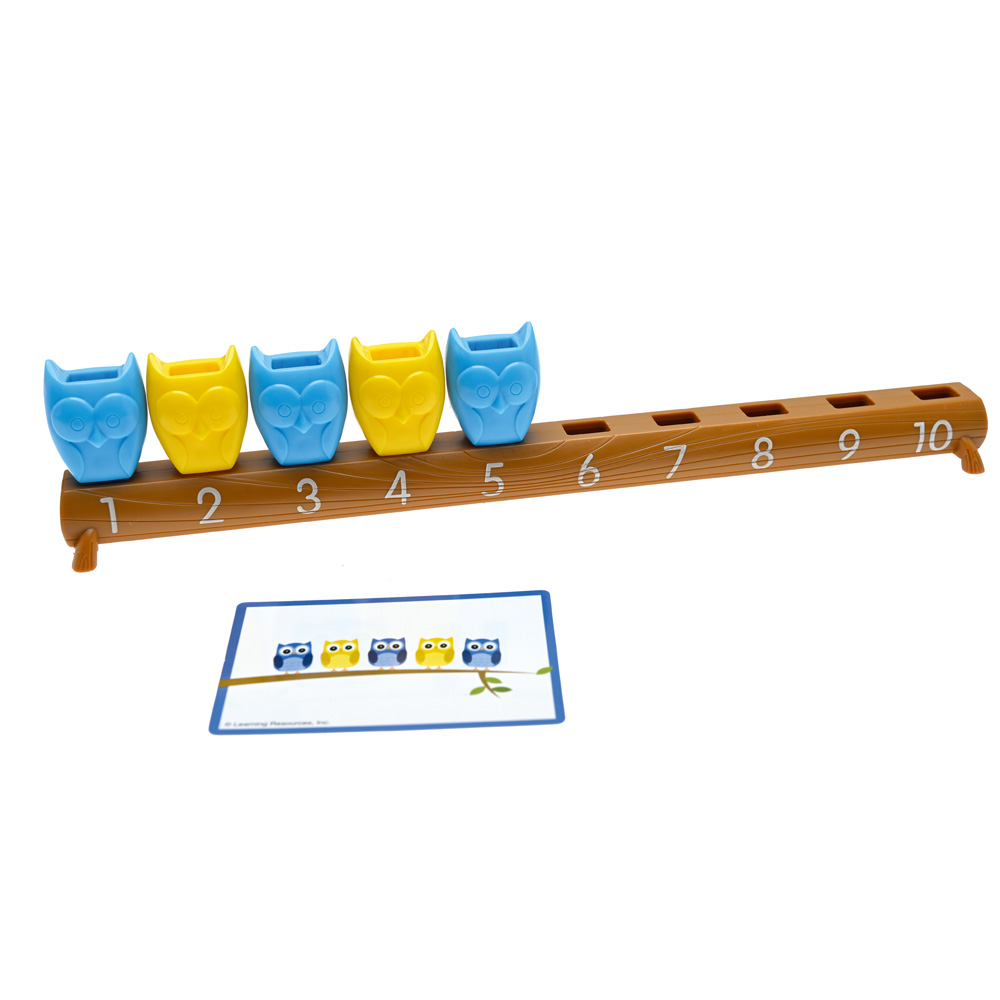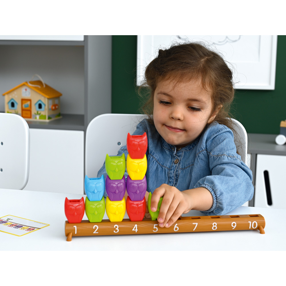 Die Eulen lassen sich aufeinander stapeln und warten geduldig, bis du ihre Zahl nennst. Setze sie zum Zählen nebeneinander auf den Zähl-Zweig, stapele sie zum Darstellen von Zahlen aufeinander oder sortiere sie in Gruppen, um Zahlen miteinander zu vergleichen. Die Eulen kommen in fünf verschiedenen Farben vor und eignen sich perfekt für Lernspiele zum Erkennen von Farben, Mustern und Sortieren.