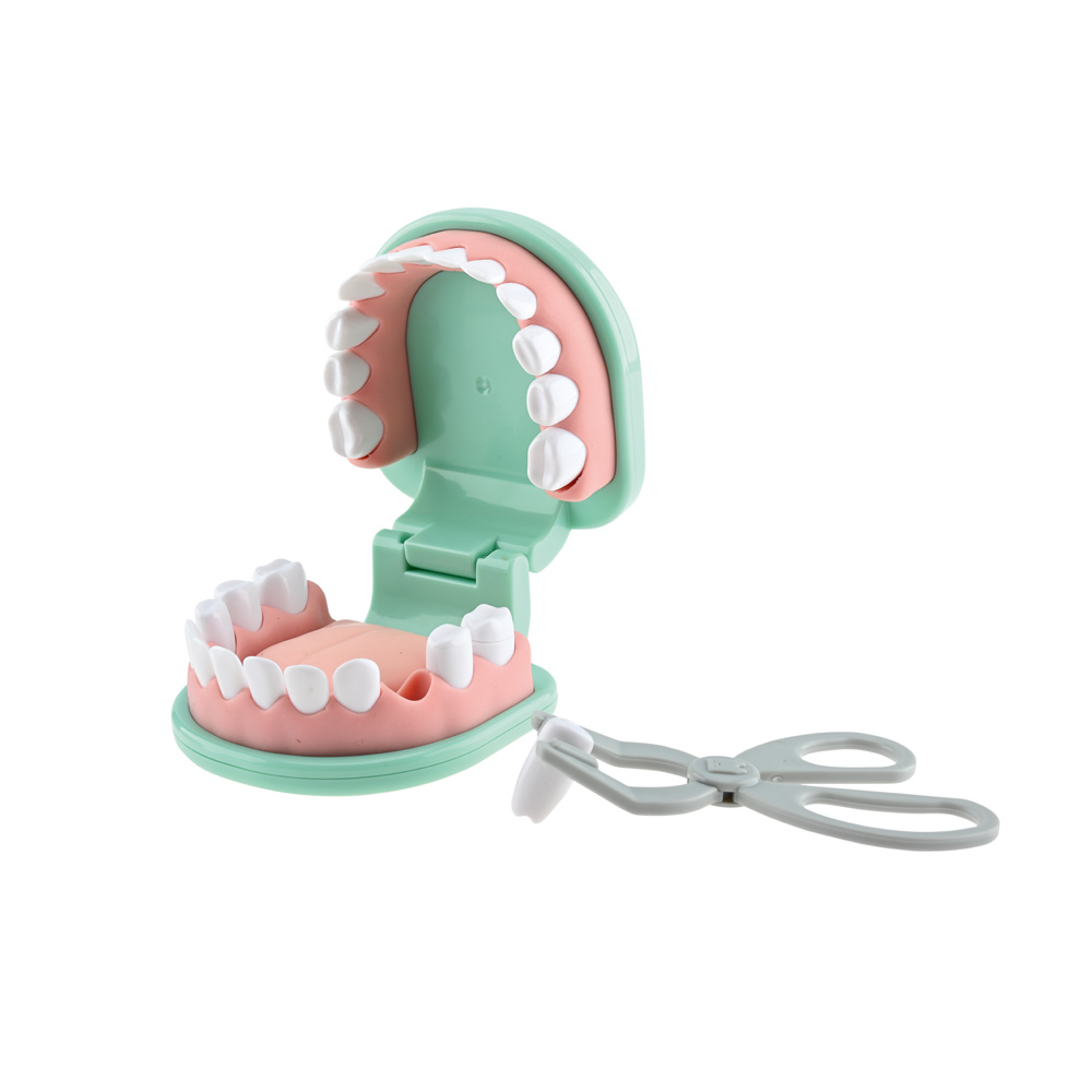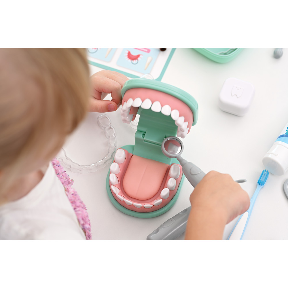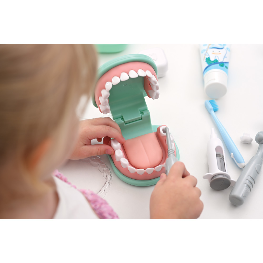 Ein lehrreiches Spielset mit herausnehmbaren Zähnen und Zahnspange, welches Kindern eine gesunde Zahnhygiene vermittelt. Es enthält eine Vielzahl von Zubehörteilen, die es Kindern ermöglichen, in die Rolle eines Zahnarztes oder eines Patienten zu schlüpfen. Mit jeder Menge Zubehör, u. a. Polierwerkzeuge, Zahnspiegel, Zange, Zahnbürste, Karies-Aufkleber u.v.m.