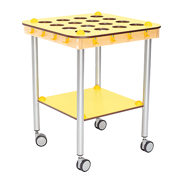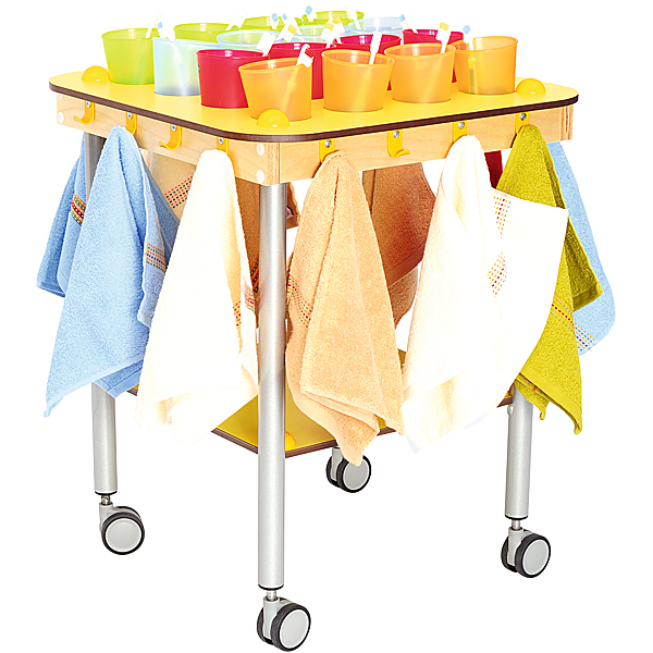 Aus HPL-Platte (Stärke: 10 mm); mit runden Metallbeinen (Durchmesser: 32 mm); auf feststellbaren Rollen. Aussparungen für Becher sorgen für Ordnung und schützen vor Umkippen; rund um den Wagen finden sich Haken für Handtücher; mit zusätzlicher Ablagefläche unter der Tischplatte auf einer Höhe von 25 cm.