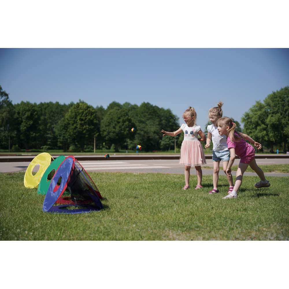 • 4 farbige Körbe; je 3 Seiten mit verschieden grossen Wurföffnungen (13, 27 und 60 cm)